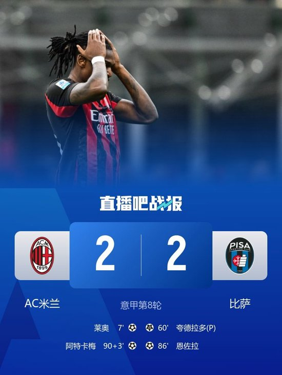 直播吧10月25日讯 北京时间10月25日凌晨2时45分,意甲第8轮,米兰坐镇圣西罗球场迎战比萨。上半场,莱奥首开纪录。米兰半场1-0领先比萨。下半场,德温特手球犯规送点,夸德拉多点射破门,随后恩佐拉破门反超,阿特卡梅替补绝平。最终米兰2-2战平比萨,各项赛事连续8场不败,本轮先赛的情况下,米兰暂时2分优势领跑意甲。